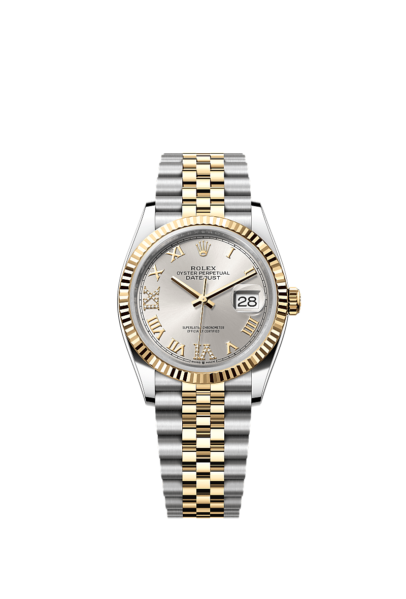 This Oyster Perpetual Datejust 36 in Oystersteel and yellow gold features a silver, diamond-set dial and a Jubilee bracelet.
