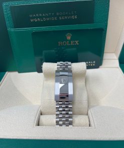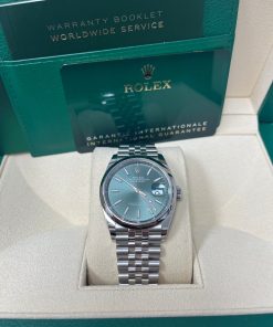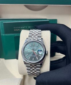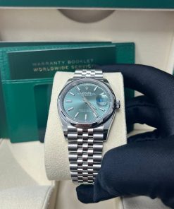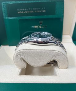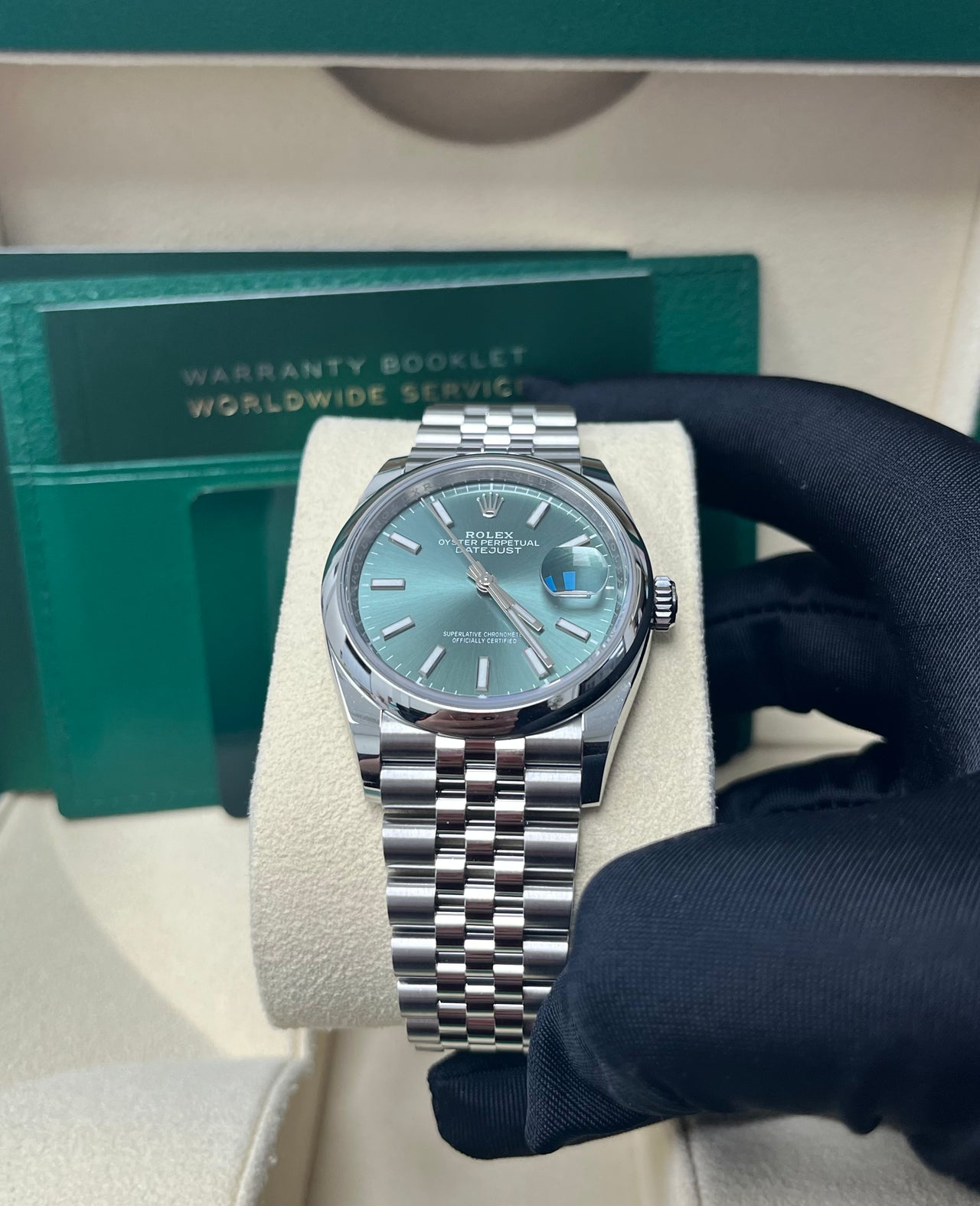 36mm Oystersteel case, screw-down back, screw-down crown with twinlock double waterproofness system, domed bezel, scratch-resistant sapphire crystal with cyclops lens over the date, mint green dial, index hour markers, Rolex calibre 3235 perpetual self-winding movement with centre hour, minute and seconds hands, instantaneous date with rapid setting, and stop-seconds for precise time setting, approximately 70 hours of power reserve, Jubilee bracelet with five-piece links, folding Oysterclasp buckle