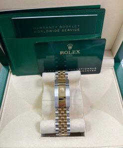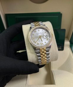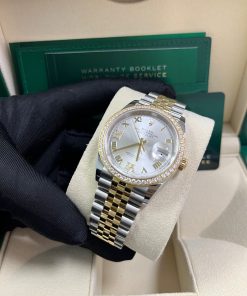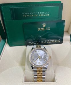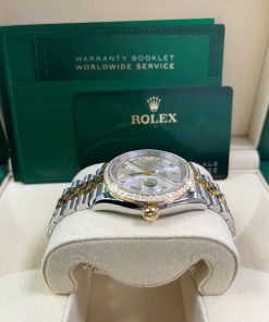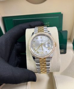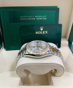 36mm yellow Rolesor case with Oystersteel monobloc middle case, screw-down steel back, screw-down 18K yellow crown, 18K yellow diamond bezel, silver dial, Roman numerals with diamond set 6 and 9, Rolex calibre 3235 self-winding movement with date at 3 o’clock, approximately 70 hours of power reserve, yellow Rolesor Jubilee bracelet with five-piece links, folding Oysterclasp buckle with Easylink 5mm comfort extension link. Waterproof to 100 meters. Redesigned for Baselworld 2018 with updated case sides, lugs, and calibre 3235 movement.