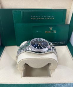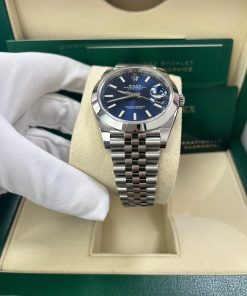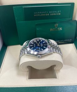 41mm 904L stainless steel case, screw-down steel back, screw-down crown with twin lock double waterproofness system, smooth bezel, scratch-resistant double anti-reflective sapphire crystal with cyclops lens over the date, blue dial, index hour markers. Rolex calibre 3235 perpetual self-winding movement with date at 3 o’clock that changes instantaneously at midnight in a few thousandths of a second, approximately 70 hours of power reserve, 904L steel Jubilee bracelet with five-piece links, folding Oysterclasp buckle with Easylink 5mm comfort extension link. Waterproof up to 100 meters.