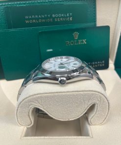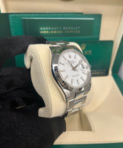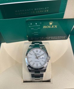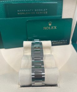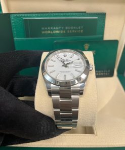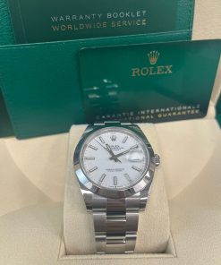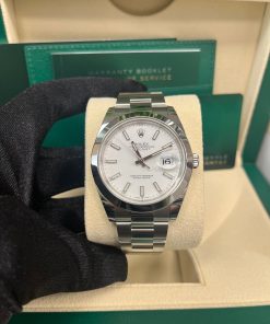 41mm 904L stainless steel case, screw-down steel back, screw-down crown with twinlock double waterproofness system, smooth bezel, scratch-resistant double anti-reflective sapphire crystal with cyclops lens over the date, white dial, index hour markers, Rolex calibre 3235 perpetual self-winding movement with date at 3 o’clock that changes instantaneously at midnight in a few thousandths of a second, approximately 70 hours of power reserve, 904L steel Oyster bracelet with flat three-piece links, folding Oysterclasp buckle with Easylink 5mm comfort extension link. Waterproof to 100 meters.