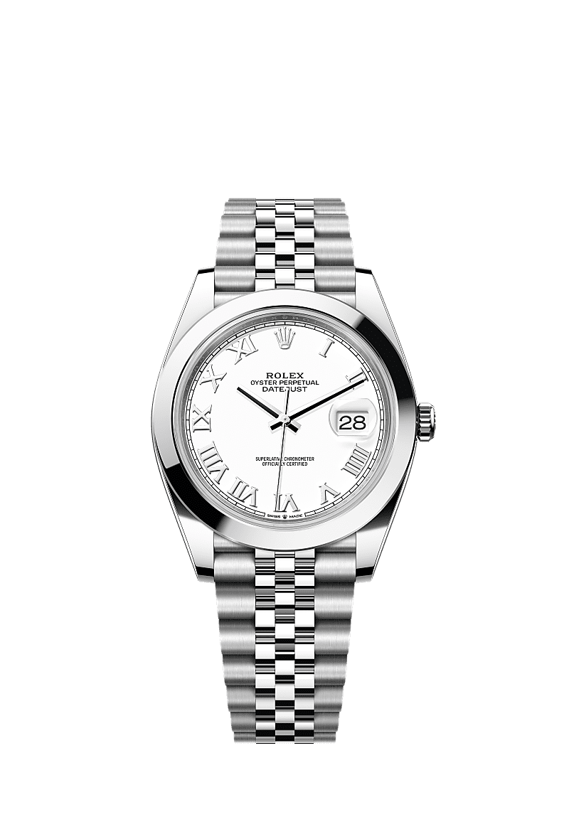 This Oyster Perpetual Datejust 41 in Oystersteel features a white dial and a Jubilee bracelet.