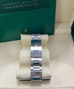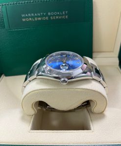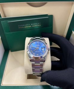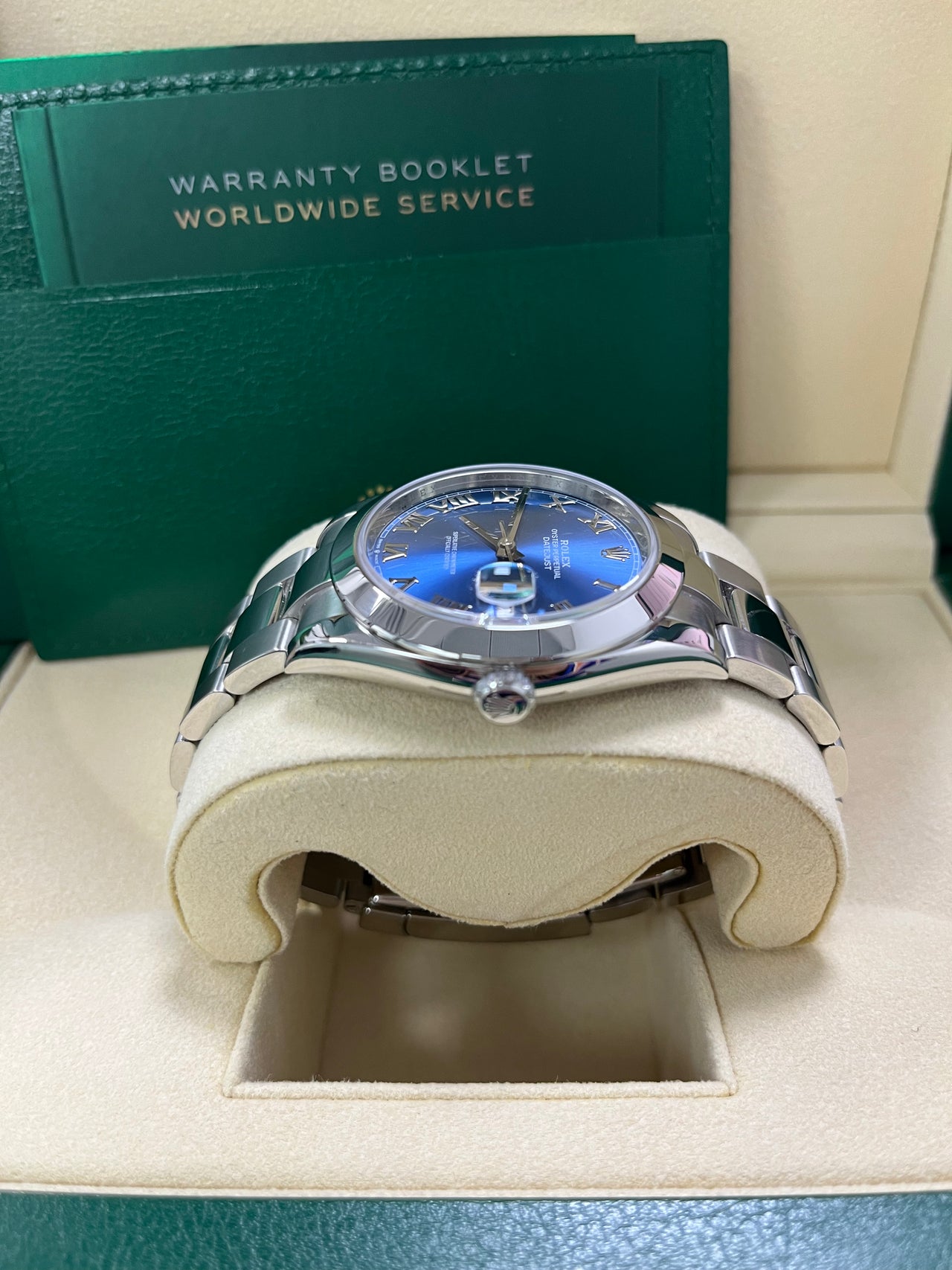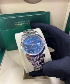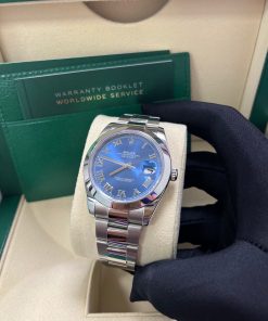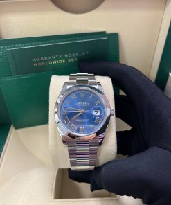 41mm 904L stainless steel case, screw-down steel back, screw-down crown with twinlock double waterproofness system, smooth bezel, scratch-resistant double anti-reflective sapphire crystal with cyclops lens over the date, blue dial, Roman numerals, Rolex calibre 3235 perpetual self-winding movement with date at 3 o’clock that changes instantaneously at midnight in a few thousandths of a second, approximately 70 hours of power reserve, 904L steel Oyster bracelet with flat three-piece links, folding Oysterclasp buckle with Easylink 5mm comfort extension link. Waterproof to 100 meters.