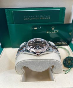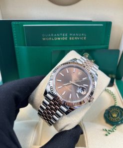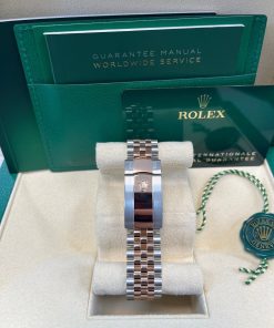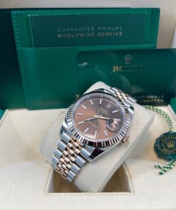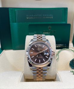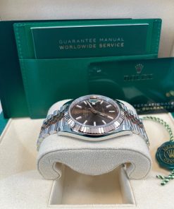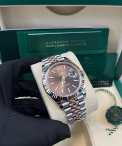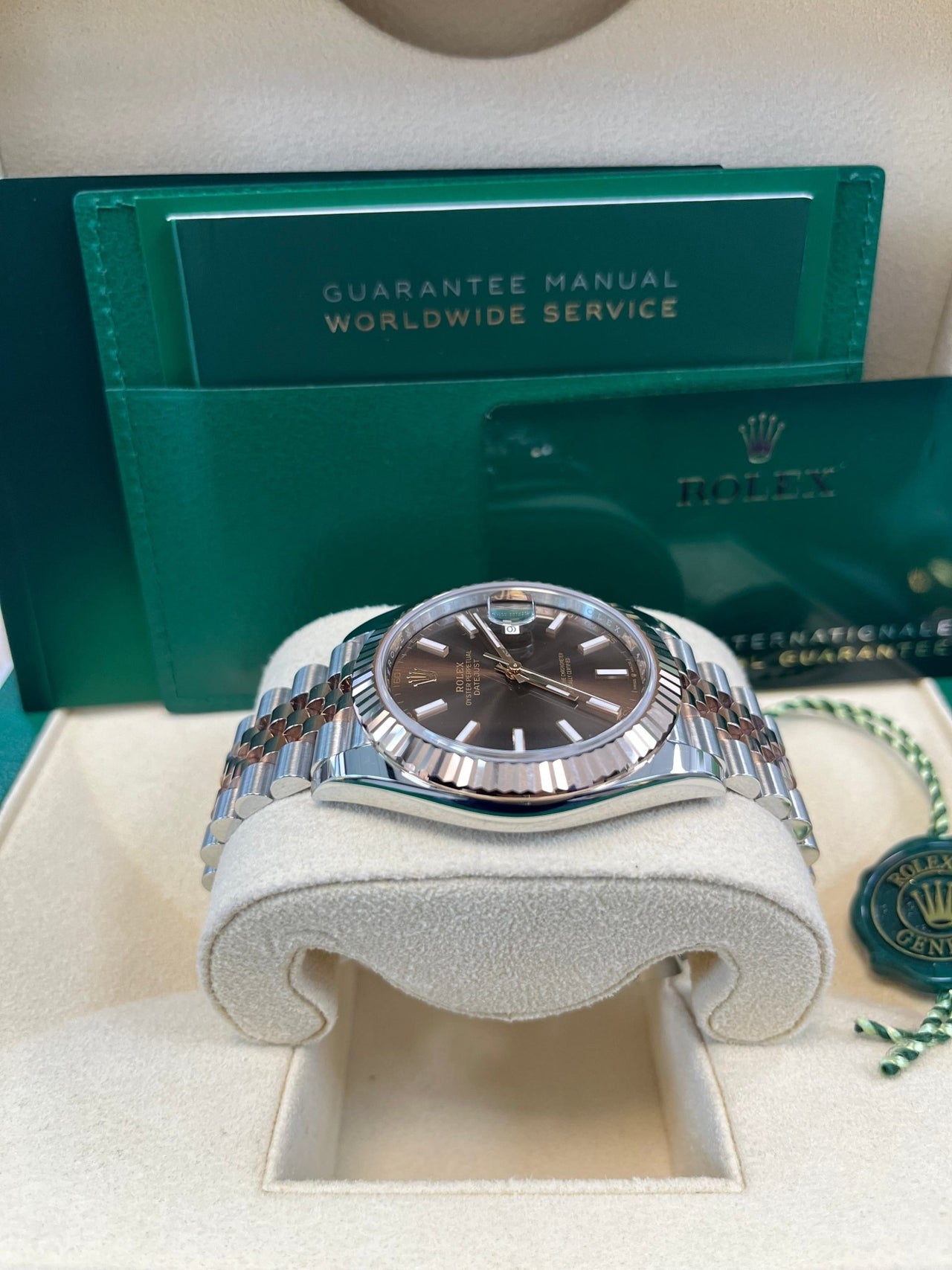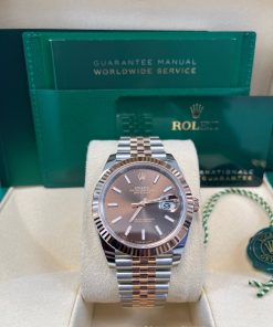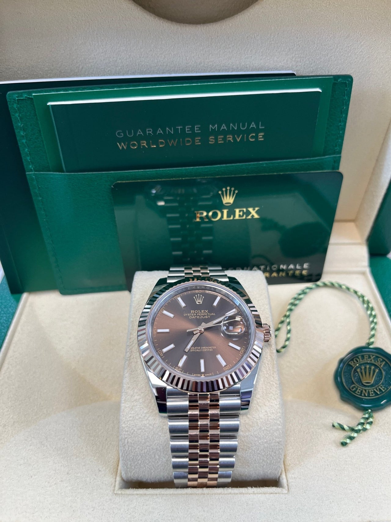 41mm Everose Rolesor case with 904L steel monobloc middle case, screw-down steel back, 18K Everose gold fluted bezel, scratch-resistant double anti-reflective sapphire crystal with cyclops lens over the date, chocolate dial, index hour markers. Rolex calibre 3235 perpetual self-winding movement with date at 3 o’clock that changes instantaneously at midnight in a few thousandths of a second, approximately 70 hours of power reserve. Everose Rolesor Jubilee bracelet made from a combination of 904L steel and 18K Everose gold with five-piece links, folding Oysterclasp buckle with Easylink 5mm comfort extension link. Water-resistant up to 100 meters.