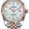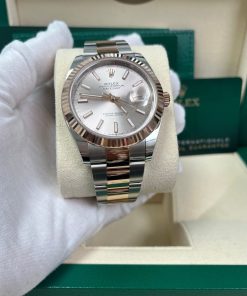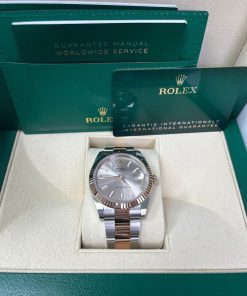 41mm Everose Rolesor case with 904L steel monobloc middle case, screw-down steel back, 18K Everose gold screw-down crown, 18K Everose gold fluted bezel, scratch-resistant double anti-reflective sapphire crystal with cyclops lens over the date, Sundust dial, index hour markers, Rolex caliber 3235 perpetual self-winding movement with date at 3 o’clock that changes instantaneously at midnight in a few thousandths of a second, approximately 70 hours of power reserve