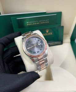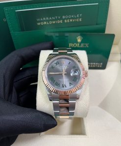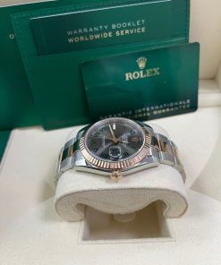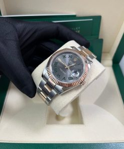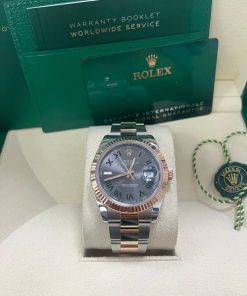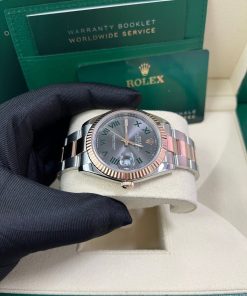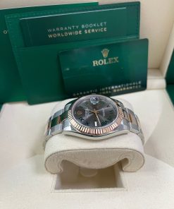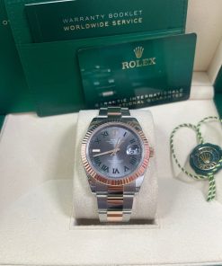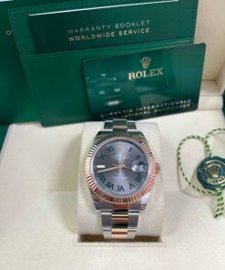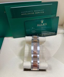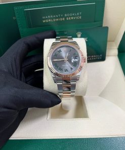 41mm Everose Rolesor case with 904L steel monobloc middle case, screw-down steel back, 18K Everose gold screw-down crown, 18K Everose gold fluted bezel, scratch-resistant double anti-reflective sapphire crystal with cyclops lens over the date, slate gray dial, green Roman numerals, Rolex calibre 3235 perpetual self-winding movement with date at 3 o’clock that changes instantaneously at midnight in a few thousandths of a second, approximately 70 hours of power reserve, Everose Rolesor Oyster bracelet made from a combination of 904L steel and 18K Everose gold with flat three-piece links, folding Oysterclasp buckle with Easylink 5mm comfort extension link. Waterproof to 100 meters.