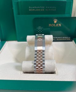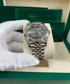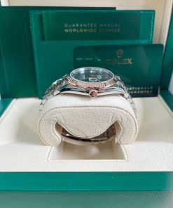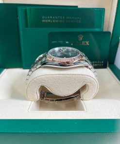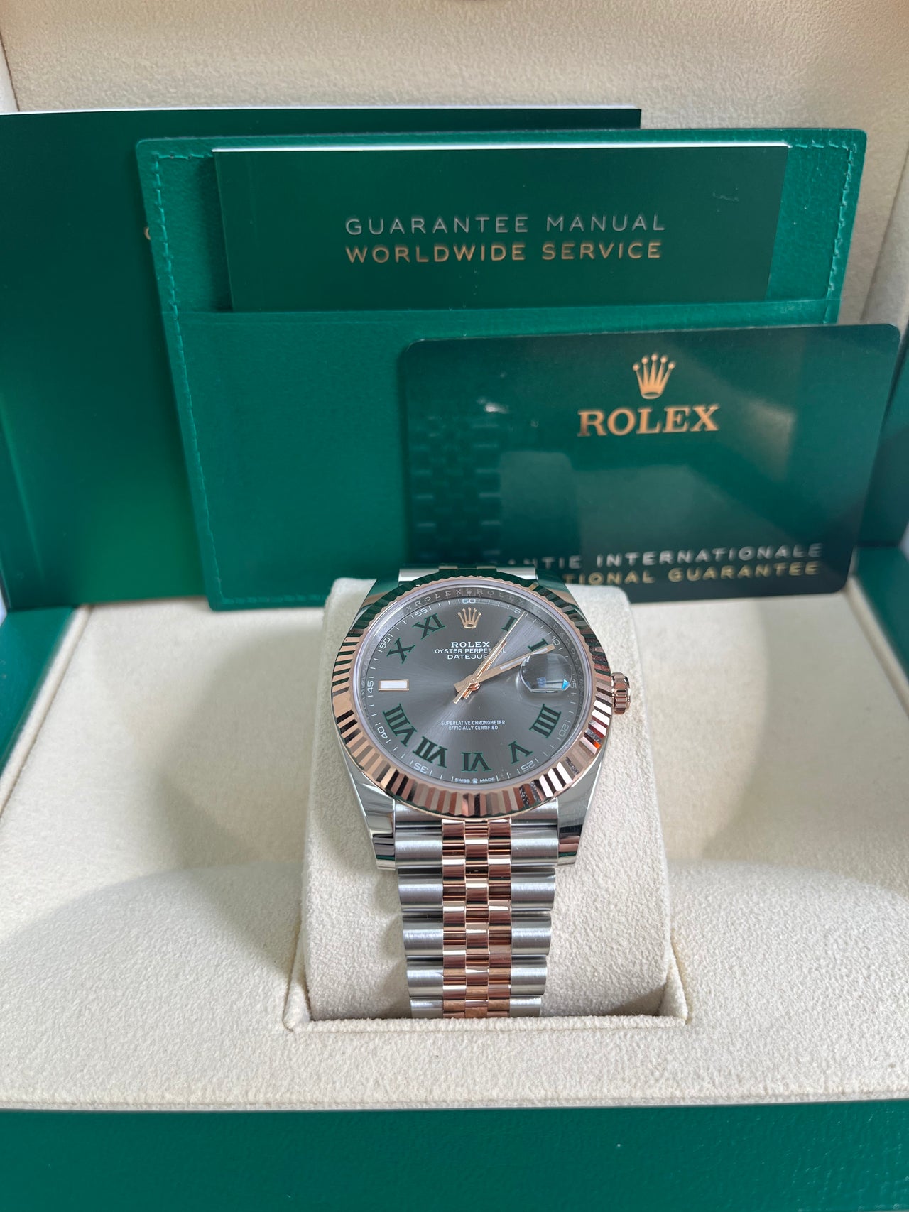 41mm Everose Rolesor case with 904L steel monobloc middle case, screw-down steel back, 18K Everose gold screw-down crown, 18K Everose gold fluted bezel, scratch-resistant double anti-reflective sapphire crystal with cyclops lens over the date, slate-gray dial, green Roman numerals. Rolex caliber 3235 perpetual self-winding movement with date at 3 o’clock that changes instantaneously at midnight in a few thousandths of a second, approximately 70 hours of power reserve, Everose Rolesor Jubilee bracelet made from a combination of 904L steel and 18K Everose gold with five-piece links, folding Oyster-Clasp buckle with Easylink 5mm comfort extension link. Water-resistant up to 100 meters.
