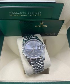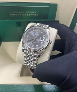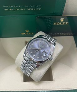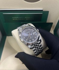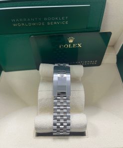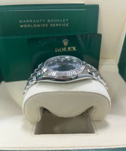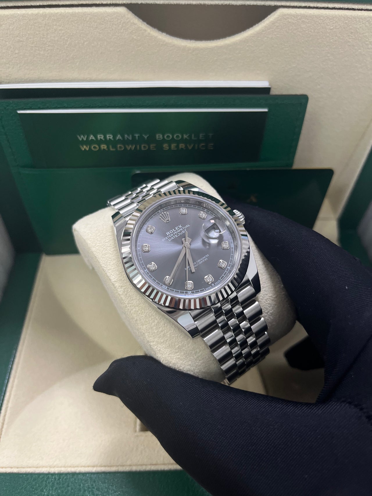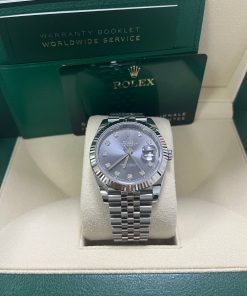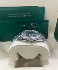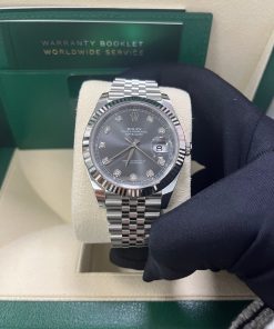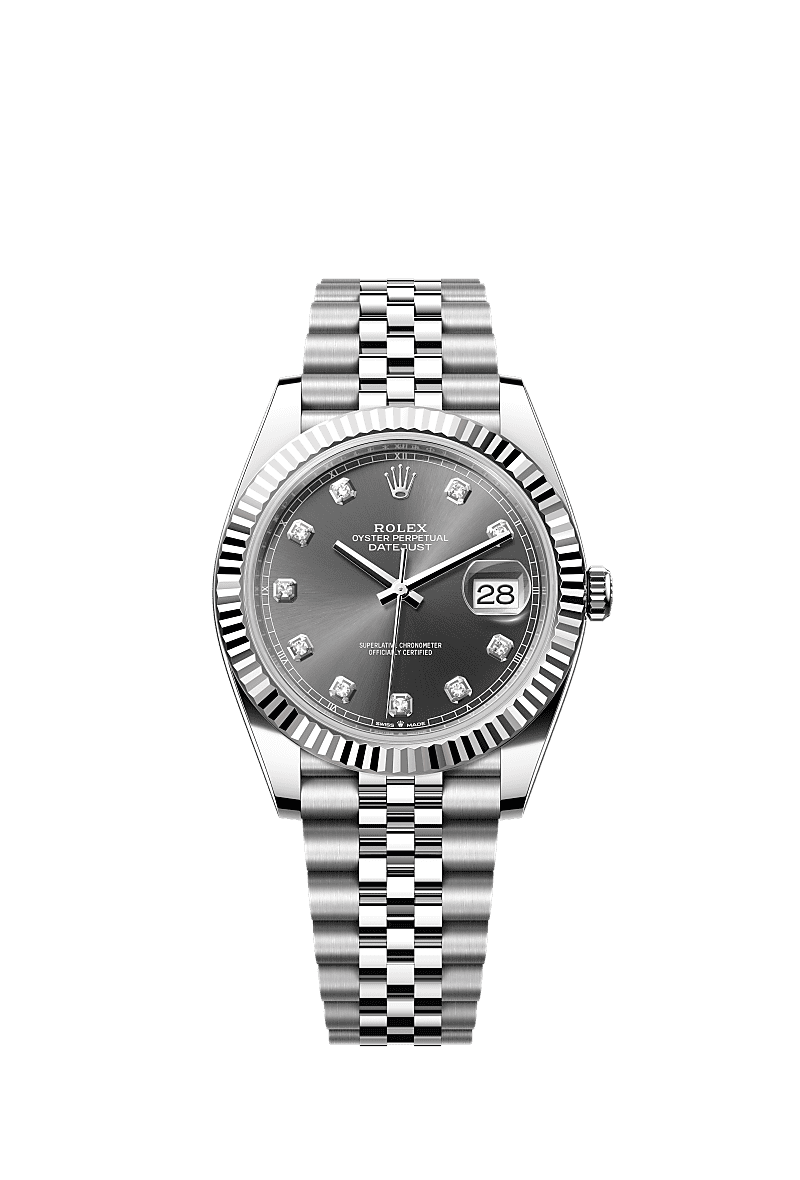 41mm white Rolesor case comprised of a 904L steel monobloc middle case, screw-down steel back, screw-down crown with twinlock double waterproofness system, 18K white gold fluted bezel, scratch-resistant double anti-reflective sapphire crystal with cyclops lens over the date, dark rhodium dial, 10 diamond hour markers, Rolex calibre 3235 perpetual self-winding movement with date at 3 o’clock that changes instantaneously at midnight in a few thousandths of a second, approximately 70 hours of power reserve, 904L steel Jubilee bracelet with five-piece links, folding Oysterclasp buckle with Easylink 5mm comfort extension link. Waterproof to 100 meters. 2020.
