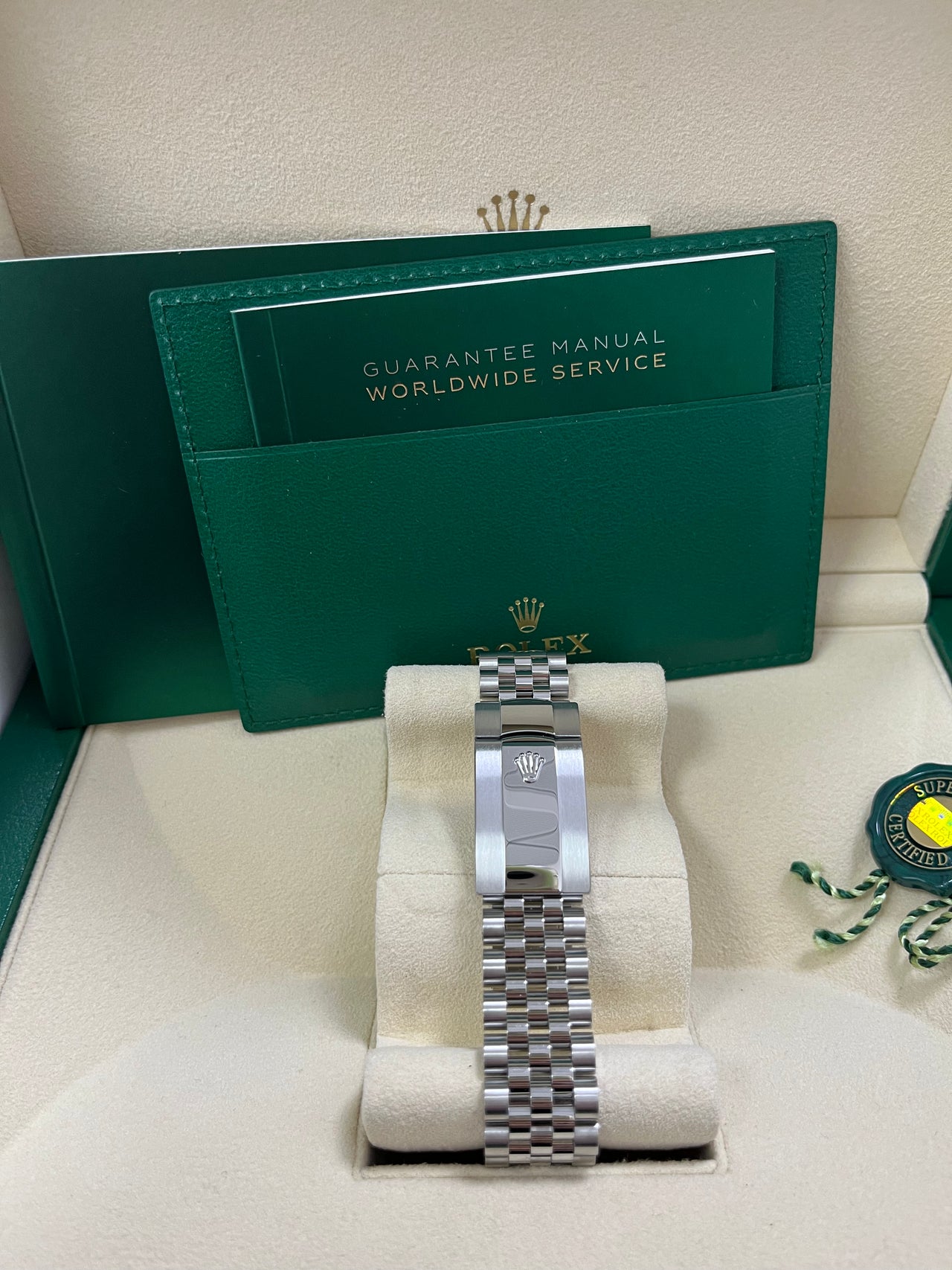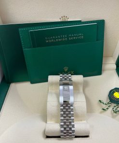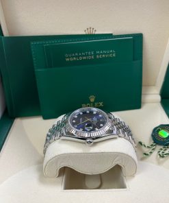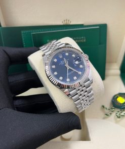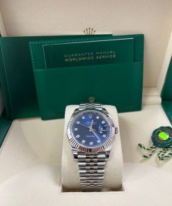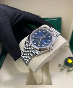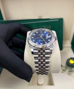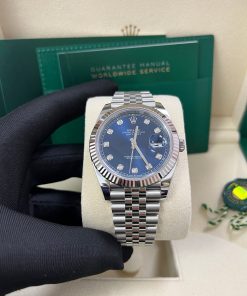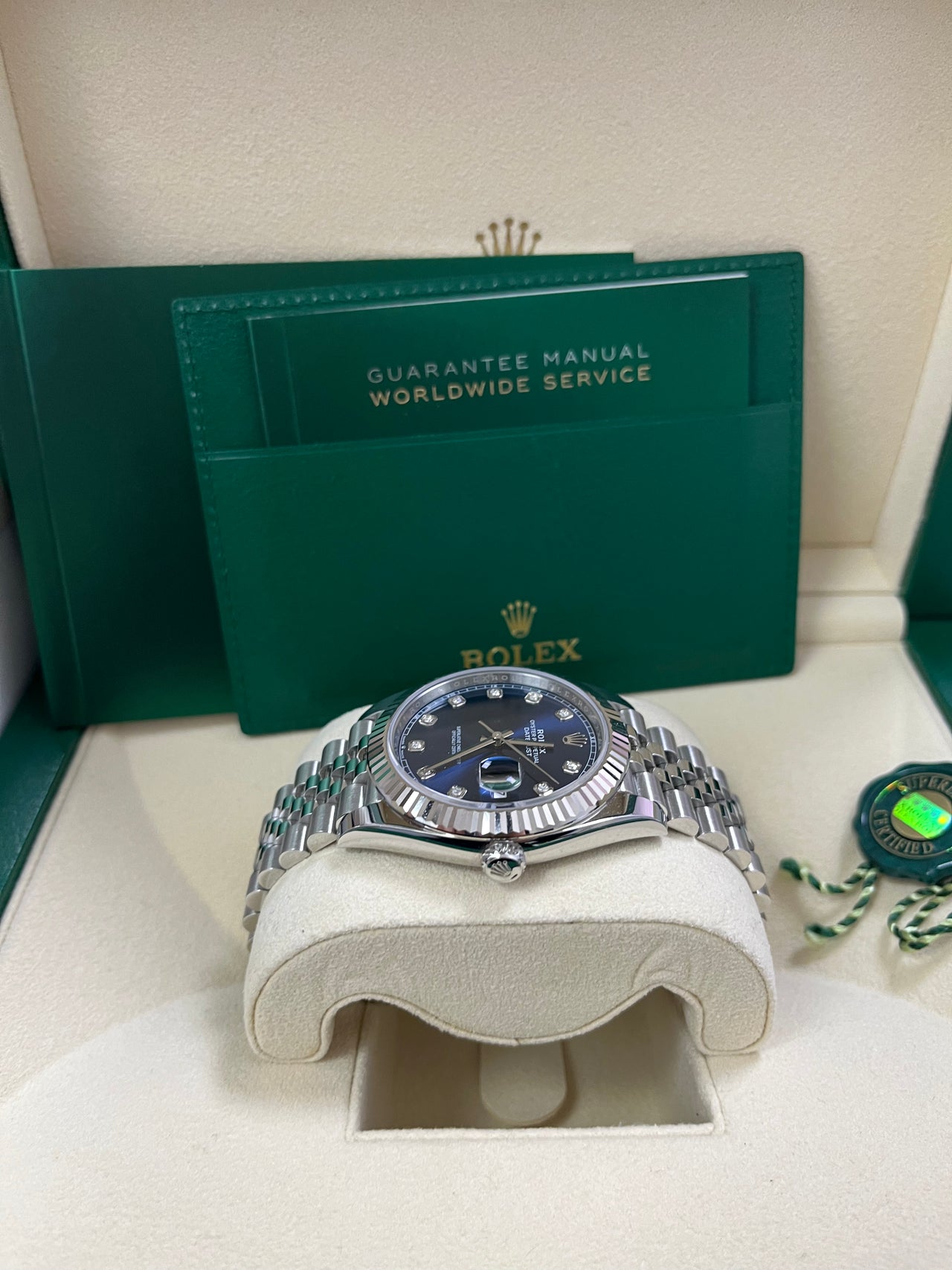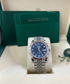41mm white Rolesor case comprised of a 904L steel monobloc middle case, screw-down steel back, screw-down crown with twin-lock double waterproofness system, 18K white gold fluted bezel, scratch-resistant double anti-reflective sapphire crystal with cyclops lens over the date, blue dial, 10 diamond hour markers. Rolex calibre 3235 perpetual self-winding movement with date at 3 o’clock that changes instantaneously at midnight in a few thousandths of a second, approximately 70 hours of power reserve. 904L steel Jubilee bracelet with five-piece links, folding Oyster-Clasp buckle with Easylink 5mm comfort extension link. Water-resistant up to 100 meters.