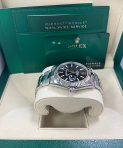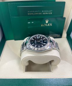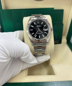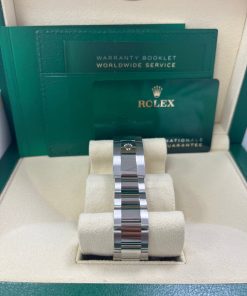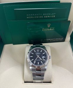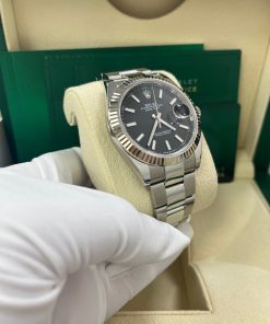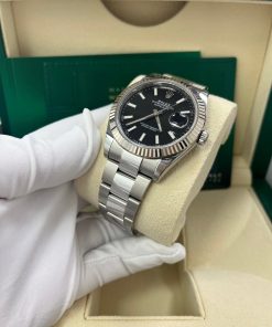 41mm white Rolesor case comprised of a 904L steel monobloc middle case, screw-down steel back, screw-down crown with twin lock double waterproofness system, 18K white gold fluted bezel, scratch-resistant double anti-reflective sapphire crystal with cyclops lens over the date, black dial, index hour markers. Rolex calibre 3235 perpetual self-winding movement with date at 3 o’clock that changes instantaneously at midnight in a few thousandths of a second, approximately 70 hours of power reserve, 904L steel oster bracelet with five-piece links, folding Oysterclasp buckle with Easylink 5mm comfort extension link. Waterproof up to 100 meters.
