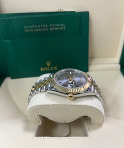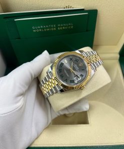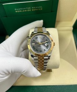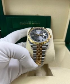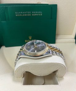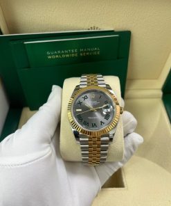 41mm Everose Rolesor case with 904L steel monobloc middle case, screw-down steel back, 18K Yellow Gold screw-down crown, 18K Yellow Gold fluted bezel, scratch-resistant double anti-reflective sapphire crystal with cyclops lens over the date, slate-gray dial, green Roman numerals. Rolex caliber 3235 perpetual self-winding movement with date at 3 o’clock that changes instantaneously at midnight in a few thousandths of a second, approximately 70 hours of power reserve, Everose Rolesor Jubilee bracelet made from a combination of 904L steel and 18K Yellow Gold with five-piece links, folding Oyster-Clasp buckle with Easylink 5mm comfort extension link. Water-resistant up to 100 meters.