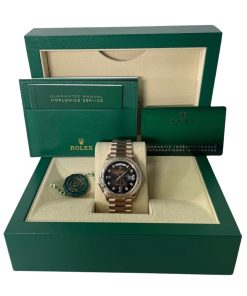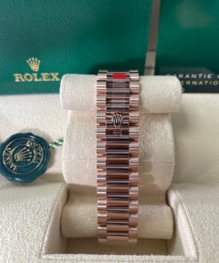 36mm 18K Everose gold case, screw-down back, screw-down crown with twinlock double waterproofness system, fluted bezel, scratch-resistant sapphire crystal with cyclops lens over the date, brown ombre´ dial, diamond hour markers, Rolex calibre 3255 perpetual self-winding movement with centre hour, minute and seconds hands, instantaneous day and date in apertures, unrestricted rapid-setting, and stop-seconds for precise time setting, approximately 70 hours of power reserve, 18K Everose gold President bracelet with semi-circular three-piece links, concealed folding Crownclasp buckle. Waterproof to 100 meters.