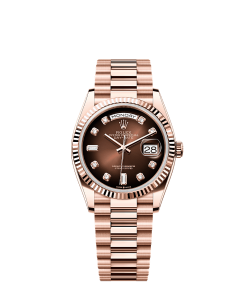 36mm 18K Everose gold case, screw-down back, screw-down crown with twinlock double waterproofness system, fluted bezel, scratch-resistant sapphire crystal with cyclops lens over the date, brown ombre´ dial, diamond hour markers, Rolex calibre 3255 perpetual self-winding movement with centre hour, minute and seconds hands, instantaneous day and date in apertures, unrestricted rapid-setting, and stop-seconds for precise time setting, approximately 70 hours of power reserve, 18K Everose gold President bracelet with semi-circular three-piece links, concealed folding Crownclasp buckle. Waterproof to 100 meters.