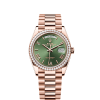 This dial features hour markers in 18 ct gold, set with 32 diamonds, and a Roman VI and IX in 18 ct gold, set with 24 diamonds. The Oyster Perpetual Day-Date 36 is presented with a dial made from eisenkiesel, a deep brown decorative stone used by the brand for the first time in 2021.