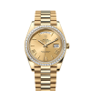 It was therefore identical to the fluting on the case back, which was also screwed onto the case for waterproofness, using specific Rolex tools. Over time, the fluting became an aesthetic element, a genuine Rolex signature feature. Today the fluted bezel is a mark of distinction, in gold on this Day-Date 36.