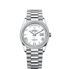 The Oyster Perpetual Day-Date 36 in platinum, with a white mother-of-pearl, diamond-set dial, diamond-set bezel and a President bracelet.