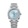 The Oyster Perpetual Day-Date 36 in platinum, with a bright blue, diamond-set dial, diamond-set bezel and a President bracelet.