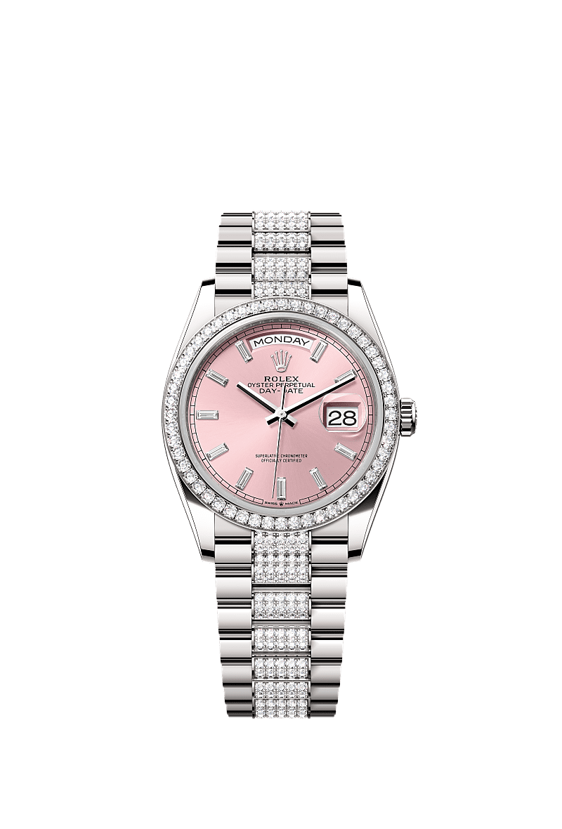 The Oyster Perpetual Day-Date 36 in 18 ct white gold, with a pink, diamond-set dial, diamond-set bezel and a diamond-set President bracelet.