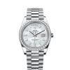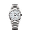 The Oyster Perpetual Day-Date 36 in 18 ct yellow gold with a white mother-of-pearl, diamond-set dial, fluted bezel and a President bracelet.