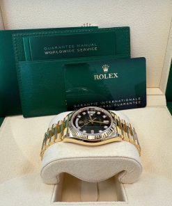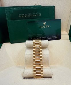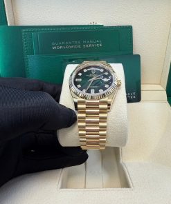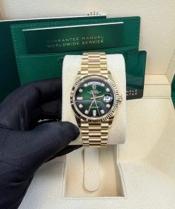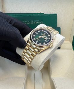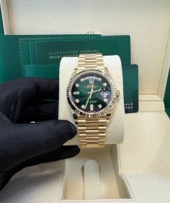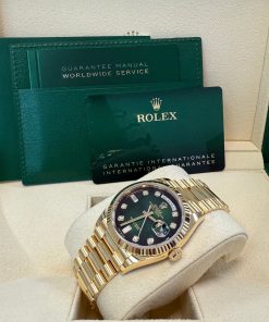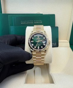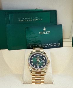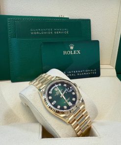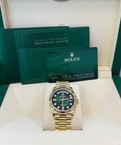 36mm 18K yellow gold case, screw-down back, screw-down crown with twinlock double waterproofness system, fluted bezel, scratch-resistant sapphire crystal with cyclops lens over the date, green ombre´ dial, diamond hour markers, Rolex calibre 3255 perpetual self-winding movement with centre hour, minute and seconds hands, instantaneous day and date in apertures, unrestricted rapid-setting, and stop-seconds for precise time setting, approximately 70 hours of power reserve, 18K yellow gold President bracelet with semi-circular three-piece links, concealed folding Crownclasp buckle. Waterproof to 100 meters.
