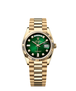 36mm 18K yellow gold case, screw-down back, screw-down crown with twinlock double waterproofness system, fluted bezel, scratch-resistant sapphire crystal with cyclops lens over the date, green ombre´ dial, diamond hour markers, Rolex calibre 3255 perpetual self-winding movement with centre hour, minute and seconds hands, instantaneous day and date in apertures, unrestricted rapid-setting, and stop-seconds for precise time setting, approximately 70 hours of power reserve, 18K yellow gold President bracelet with semi-circular three-piece links, concealed folding Crownclasp buckle. Waterproof to 100 meters.