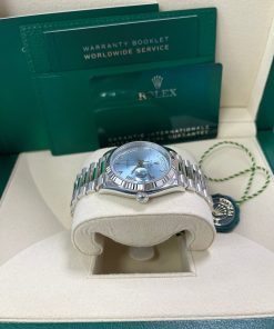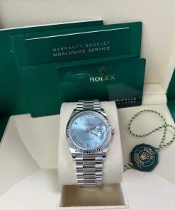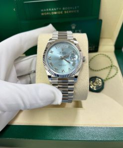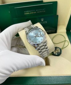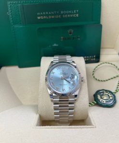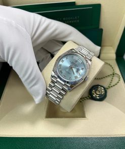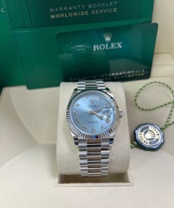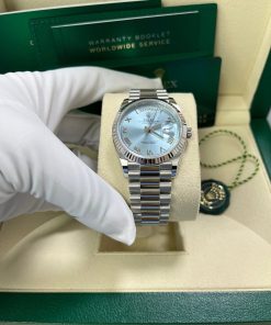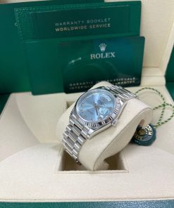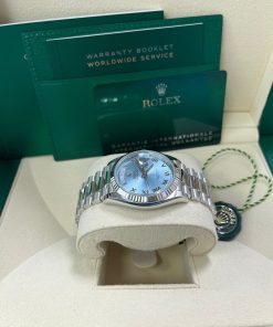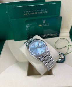 36mm platinum case, screw-down back, screw-down crown with twinlock double waterproofness system, fluted bezel, scratch-resistant sapphire crystal with cyclops lens over the date, ice blue dial, Roman numerals, Rolex calibre 3255 perpetual self-winding movement with centre hour, minute and seconds hands, instantaneous day and date in apertures, unrestricted rapid-setting, and stop-seconds for precise time setting, approximately 70 hours of power reserve, President bracelet with semi-circular three-piece links, concealed folding Crownclasp buckle. Waterproof to 100 metres / 330 feet.