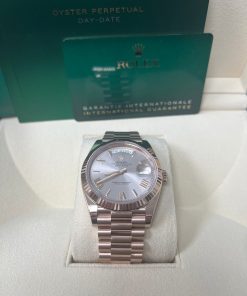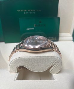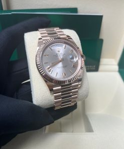 40mm 18K Everose gold case, screw-down back with Rolex fluting, screw-down crown with twinlock double waterproofness system, fluted bezel, scratch-resistant double anti-reflective sapphire crystal with cyclops lens over the date, Sundust dial, bevelled deconstructed Roman numerals, Rolex calibre 3255 automatic movement with centre hour, minute and seconds hands, instantaneous day and date in apertures, unrestricted rapid-setting, and stop-seconds for precise time setting, approximately 70 hours of power reserve, President bracelet with three-piece solid links comprised of a polished center link, satin-finished outer links, and ceramic inserts, concealed folding Crownclasp buckle. Waterproof to 100 meters. 2020.