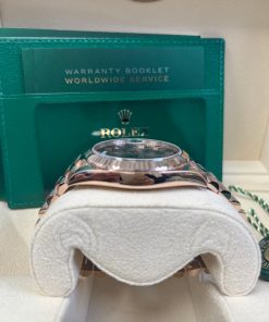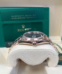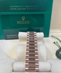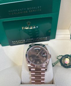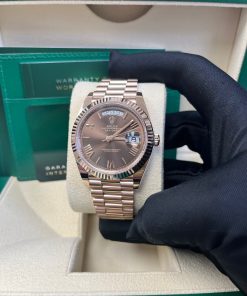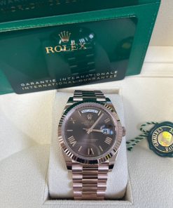 40mm 18K Everose gold case, screw-down back with Rolex fluting, screw-down crown with twin lock double waterproofness system, fluted bezel, scratch-resistant double anti-reflective sapphire crystal with cyclops lens over the date, chocolate dial, beveled deconstructed Roman numerals. Rolex caliber with 3255 automatic movements with centre hour, minute and seconds hands, instantaneous day and date in apertures, unrestricted rapid-setting, and stop-seconds for precise time setting, approximately 70 hours of power reserve. President bracelet with three-piece solid links comprised of a polished center link, satin-finished outer links, and ceramic inserts, concealed folding crown clasp buckle. Water-resistant up to 100 meters.
