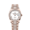 The Oyster Perpetual Day-Date 40 in platinum with a white mother-of-pearl, diamond-set dial, fluted bezel and a President bracelet.