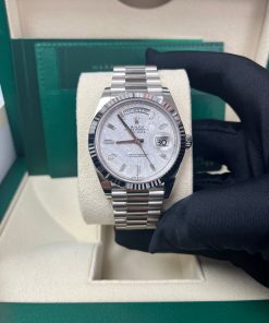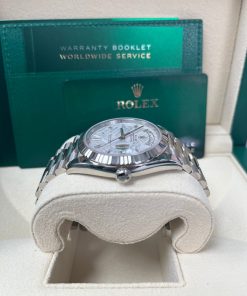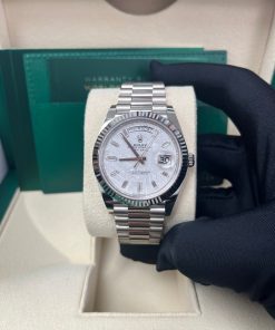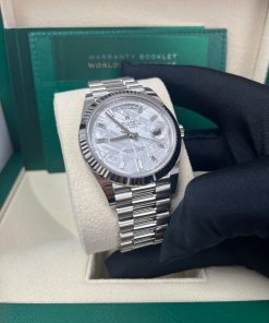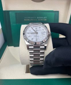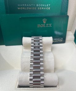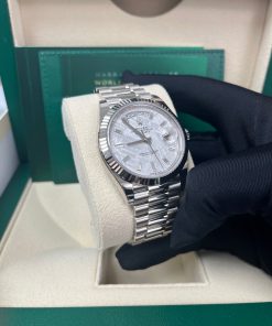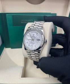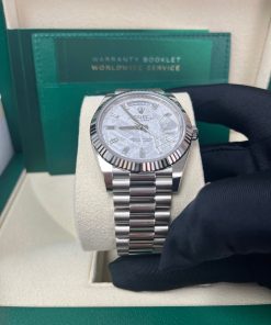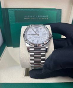 40mm 18K white gold case, screw-down back with Rolex fluting, screw-down crown with twinlock double waterproofness system, fluted bezel, scratch-resistant double anti-reflective sapphire crystal with cyclops lens over the date, meteorite dial, 10 baguette diamond hour markers, Rolex calibre 3255 automatic movement with centre hour, minute and seconds hands, instantaneous day and date in apertures, unrestricted rapid-setting, and stop-seconds for precise time setting, approximately 70 hours of power reserve, President bracelet with three-piece solid links comprised of a polished center link, satin-finished outer links, and ceramic inserts, concealed folding Crownclasp buckle. Waterproof to 100 meters.