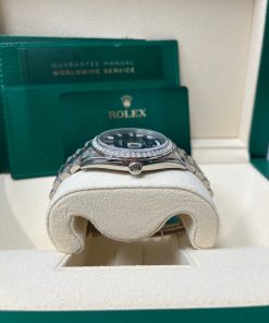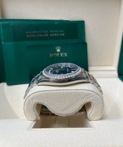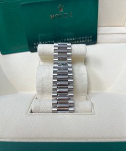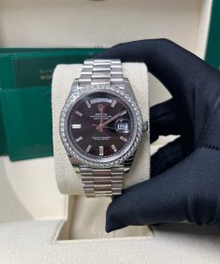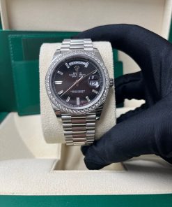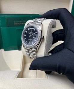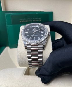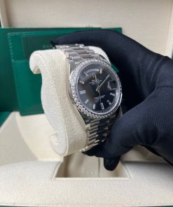 40mm 18K white gold case, screw-down back with Rolex fluting, screw-down crown with twinlock double waterproofness system, 18K white gold bezel set with 48 diamonds, scratch-resistant double anti-reflective sapphire crystal with cyclops lens over the date, black dial, 10 baguette diamond hour markers, Rolex calibre 3255 automatic movement with centre hour, minute and seconds hands, instantaneous day and date in apertures, unrestricted rapid-setting, and stop-seconds for precise time setting, approximately 70 hours of power reserve, President bracelet with three-piece solid links comprised of a polished center link, satin-finished outer links, and ceramic inserts, concealed folding Crownclasp buckle. Waterproof to 100 meters.