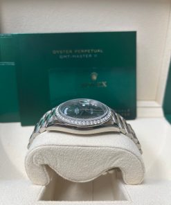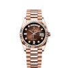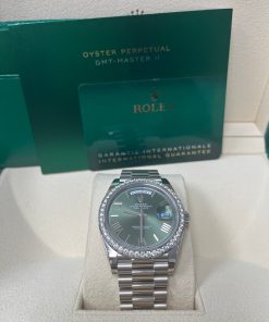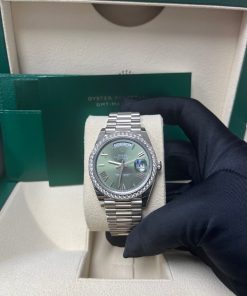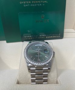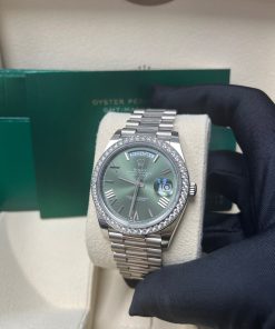 40mm 18K white gold case, screw-down back with Rolex fluting, screw-down crown with twinlock double waterproofness system, bezel set with 48 diamonds, scratch-resistant double anti-reflective sapphire crystal with cyclops lens over the date, olive green dial, bevelled deconstructed Roman numerals, Rolex calibre 3255 automatic movement with centre hour, minute and seconds hands, instantaneous day and date in apertures, unrestricted rapid-setting, and stop-seconds for precise time setting, approximately 70 hours of power reserve, President bracelet with three-piece solid links comprised of a polished center link, satin-finished outer links, and ceramic inserts, concealed folding Crownclasp buckle. Waterproof to 100 meters.