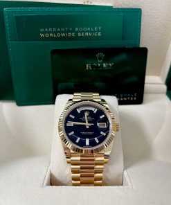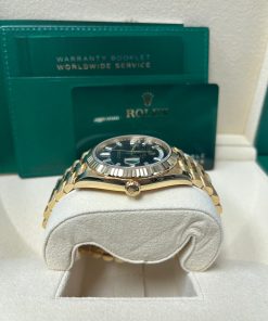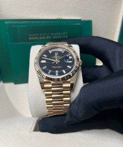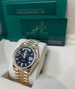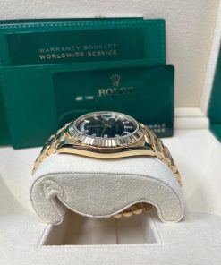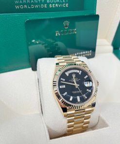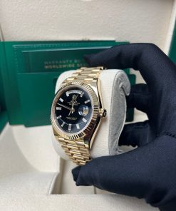 40mm 18K yellow gold case, screw-down back, screw-down crown with twinlock double waterproofness system, fluted bezel, scratch-resistant sapphire crystal with cyclops lens over the date, onyx dial, 10 baguette-cut hour markers, Rolex calibre 3255 perpetual self-winding movement with centre hour, minute and seconds hands, instantaneous day and date in apertures, unrestricted rapid-setting, and stop-seconds for precise time setting, approximately 70 hours of power reserve, President bracelet with semi-circular three-piece links, concealed folding Crownclasp buckle. Waterproof to 100 metres / 330 feet.