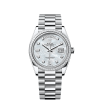 The Oyster Perpetual Day-Date 40 in 18 ct yellow gold, with a white mother-of-pearl, diamond-set dial, diamond-set bezel and a President bracelet.