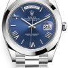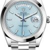 40mm 950 platinum case, screw-down back with Rolex fluting, screw-down crown with twinlock double waterproofness system, smooth bezel, scratch-resistant double anti-reflective sapphire crystal with cyclops lens over the date, ice blue quadrant motif dial, bevelled deconstructed Roman numerals, Rolex calibre 3255 automatic movement with centre hour, minute and seconds hands, instantaneous day and date in apertures, unrestricted rapid-setting, and stop-seconds for precise time setting, approximately 70 hours of power reserve, President bracelet with three-piece solid links comprised of a polished center link, satin-finished outer links, and ceramic inserts, concealed folding Crownclasp buckle. Waterproof to 100 meters. 2021.
