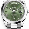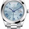 40mm 950 platinum case, screw-down back with Rolex fluting, screw-down crown with twinlock double waterproofness system, smooth bezel, scratch-resistant double anti-reflective sapphire crystal with cyclops lens over the date, ice blue diagonal motif dial, index hour markers with Chromalight, Rolex calibre 3255 automatic movement with centre hour, minute and seconds hands, instantaneous day and date in apertures, unrestricted rapid-setting, and stop-seconds for precise time setting, approximately 70 hours of power reserve, President bracelet with three-piece solid links comprised of a polished center link, satin-finished outer links, and ceramic inserts, concealed folding Crownclasp buckle. Waterproof to 100 meters.