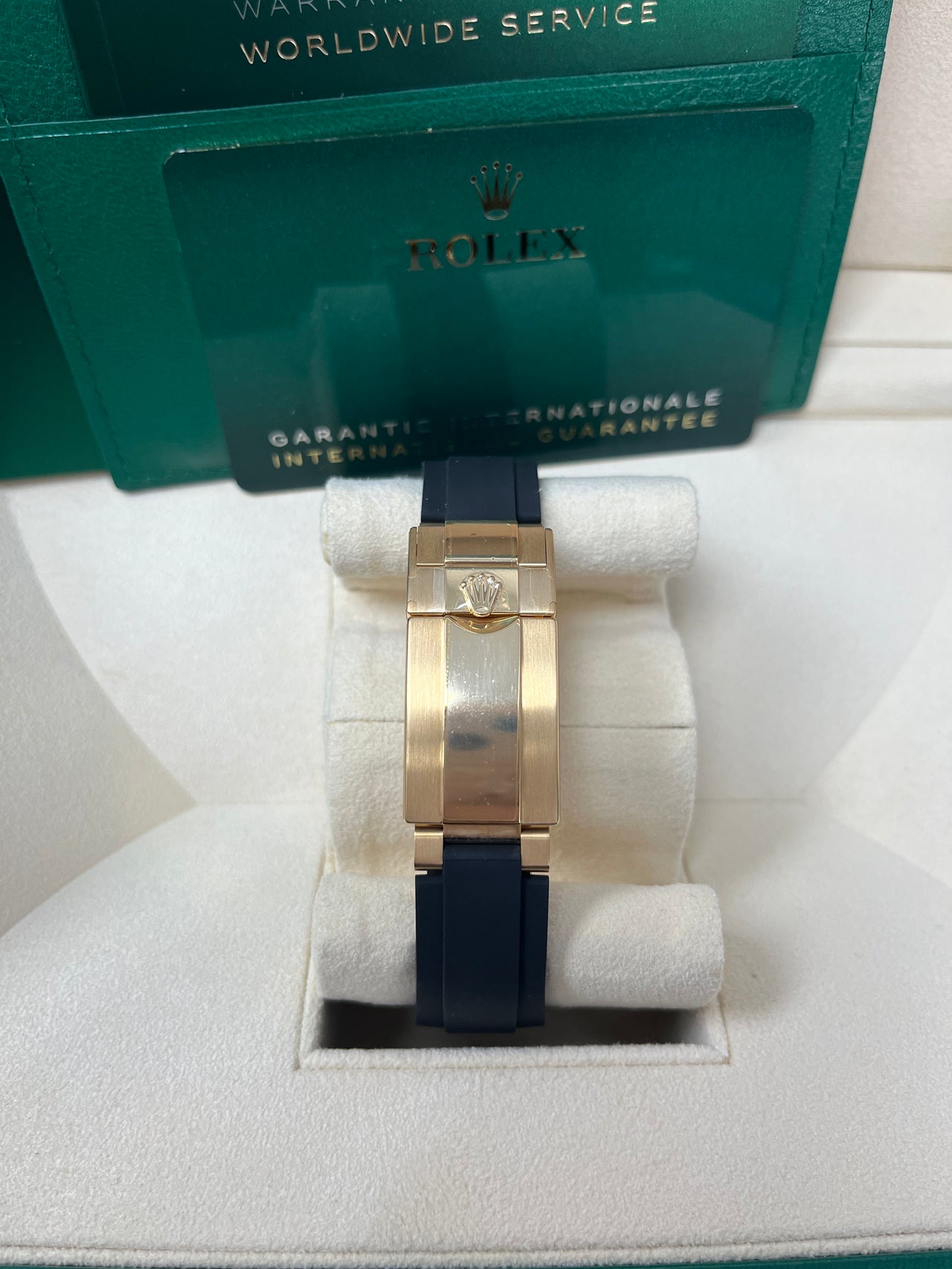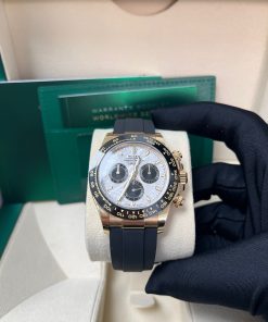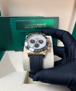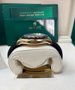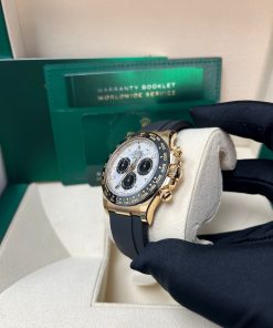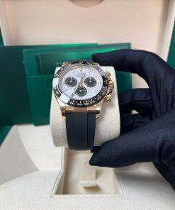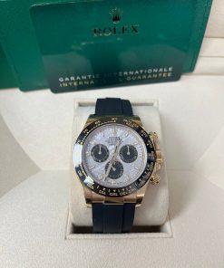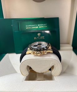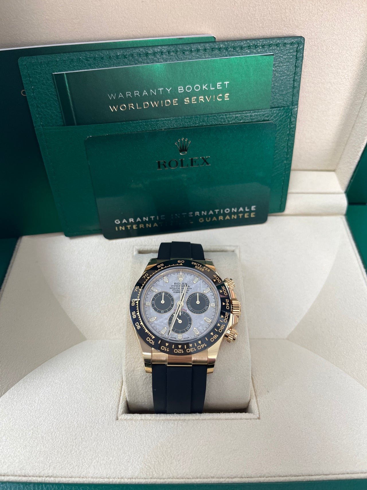 40mm 18K yellow gold case, screw-down yellow gold back, screw-down crown and push buttons with Triplock triple waterproofness, black monobloc Cerachrom bezel with engraved tachymetric scale, scratch-resistant double anti-reflective sapphire crystal, meteorite dial, black subdials, index hour markers, Rolex calibre 4130 perpetual self-winding movement with chronograph central second hand, 30-minute counter at 3 o’clock, and 12-hour counter at 9 o’clock, approximately 72 hours of power reserve, black Oysterflex strap made from flexible metal blades overmoulded with high-performance elastomer, Oysterlock folding safety buckle with Easylink 5mm rapid extension system. Waterproof to 100 meters.