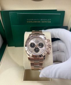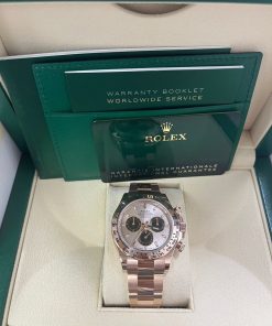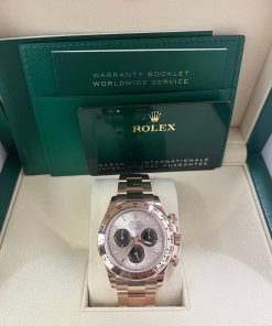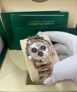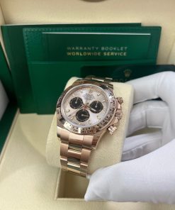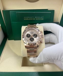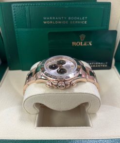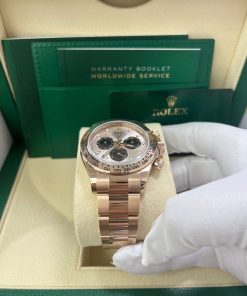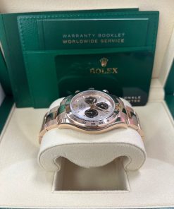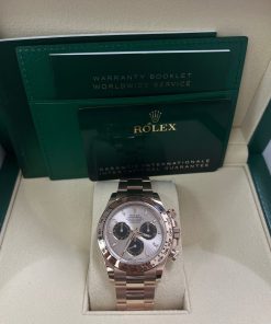 The Rolex Daytona 116505 “Sundust” showcases the signature Sundust colorway with a unique silvered, cool-toned shine that sets it apart from the typical pink hues of Rolex’s standard rose gold. Paired with sleek black sub-dials and a brushed dial finish, this timepiece offers a striking blend of depth and sophistication.