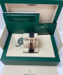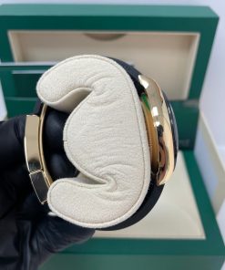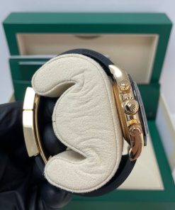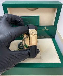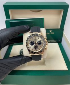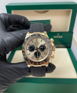 40mm 18K yellow gold case, screw-down yellow gold back, screw-down crown and push buttons with Triplock triple waterproofness, black monobloc Cerachrom bezel with engraved tachymetric scale, scratch-resistant double anti-reflective sapphire crystal, champagne dial with black subdials, index hour markers, Rolex calibre 4130 perpetual self-winding movement with chronograph central second hand, 30-minute counter at 3 o’clock, and 12-hour counter at 9 o’clock, approximately 72 hours of power reserve, black Oysterflex strap made from flexible metal blades overmoulded with high-performance elastomer, Oysterlock folding safety buckle with Easylink 5mm rapid extension system. Waterproof to 100 meters.