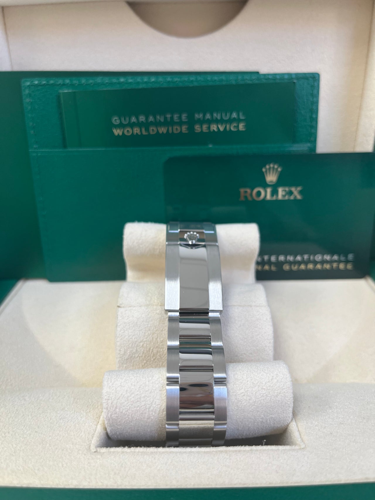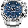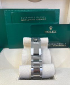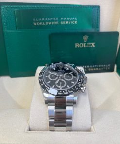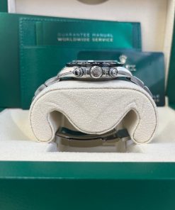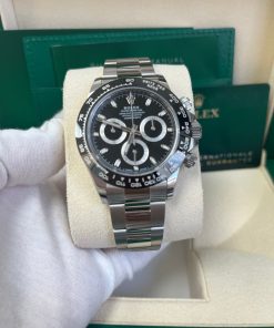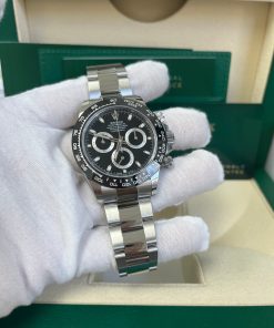40mm polished 904L stainless steel case, screw-down back and push buttons, screw-down crown and push buttons with Triplock triple waterproofness, black monobloc ceramic Cerachrom bezel with engraved tachymetric scale, scratch-resistant sapphire crystal, black lacquer dial, 18K white gold applied applique hour markers with Chromalight, grey snailed counters, automatic movement with chronograph central second hand, 30-minute counter at 3 o’clock, and 12-hour counter at 9 o’clock, approximately 72 hours of power reserve, 904L stainless steel Oyster bracelet with solid links, folding Oysterlock buckle with Easylink 5mm comfort extension link. Waterproof to 100 meters. Prices of Rolex Daytona Watch continue to rise due to very limited production levels. Introduced at Baselworld 2016 Website. 2020.
