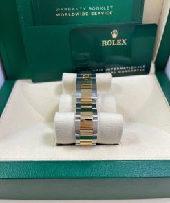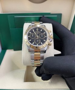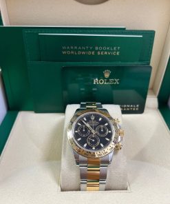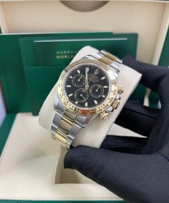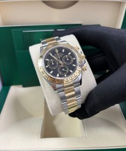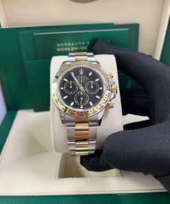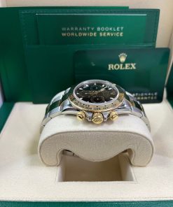 40mm Yellow Rolesor case with 904L steel monobloc middle case, screw-down steel back, screw-down crown and push buttons with Triplock triple waterproofness, fixed 18K yellow gold bezel with engraved tachymetric scale, scratch-resistant sapphire crystal, black dial, index hour markers, Rolex calibre 4130 self-winding movement with chronograph central second hand, 30-minute counter at 3 o’clock, and 12-hour counter at 9 o’clock, approximately 72 hours of power reserve, 18K yellow gold Oyster bracelet with flat three-piece links made from a combination of 904L steel and 18K yellow gold, folding Oysterlock buckle with Easylink 5mm comfort extension link. Waterproof to 100 meters. 2020.