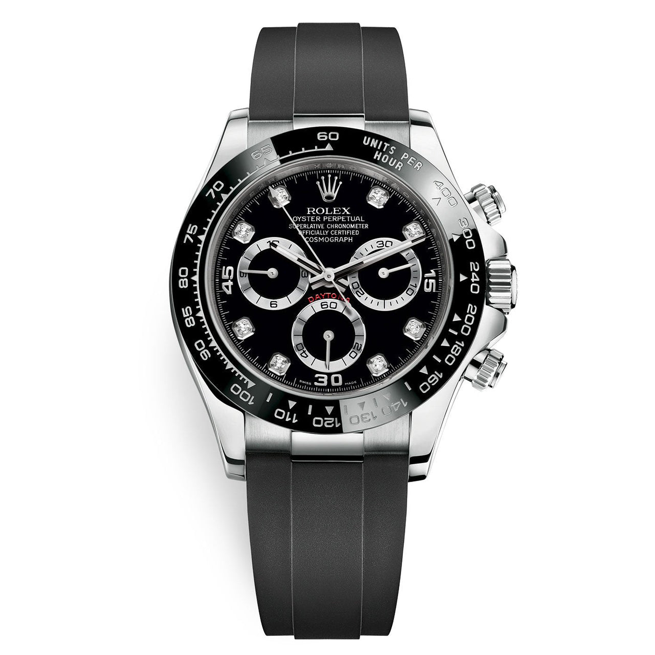 40mm 18K white gold case, screw-down white gold back, screw-down crown and push buttons with Triplock triple waterproofness, black monobloc Cerachrom bezel with engraved tachymetric scale, scratch-resistant double anti-reflective sapphire crystal, black dial, diamond hour markers, Rolex calibre 4130 perpetual self-winding movement with chronograph central second hand, 30-minute counter at 3 o’clock, and 12-hour counter at 9 o’clock, approximately 72 hours of power reserve, black Oysterflex strap made from flexible metal blades overmoulded with high-performance elastomer, Oysterlock folding safety buckle with Easylink 5mm rapid extension system. Waterproof to 100 meters.