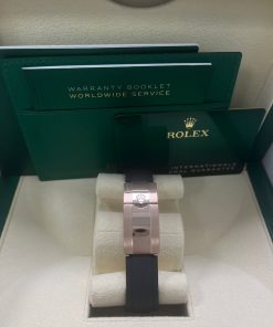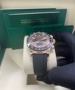 40mm 18K Everose gold case, screw-down Everose back, screw-down crown and push buttons with Triplock triple waterproofness, black monobloc Cerachrom bezel with engraved tachymetric scale, scratch-resistant double anti-reflective sapphire crystal, chocolate dial, index hour markers, Rolex calibre 4130 perpetual self-winding movement with chronograph central second hand, 30-minute counter at 3 o’clock, and 12-hour counter at 9 o’clock, approximately 72 hours of power reserve, black Oysterflex strap made from flexible metal blades overmoulded with high-performance elastomer, Oysterlock folding safety buckle with Easylink 5mm rapid extension system. Waterproof to 100 meters. 2020.