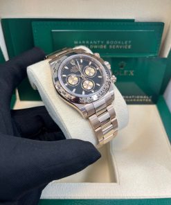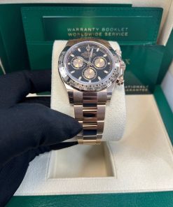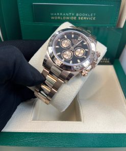 40mm 18K Everose gold case, tachymeter engraved bezel, screw-down push buttons, black dial with Everrose subdials, and Oysterlock bracelet with Easylink. 2020.