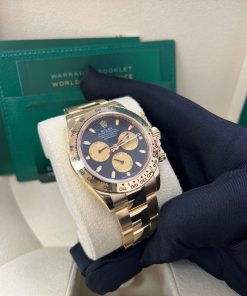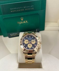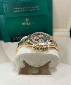 The dial features a chronograph central second hand, a 30-minute counter at 3 o’clock, and a 12-hour counter at 9 o’clock. Comes on a 18K yellow gold Oyster bracelet with flat three-piece links, folding Oysterlock buckle with Easylink 5mm comfort extension link. Waterproof to 100 meters.