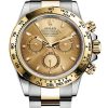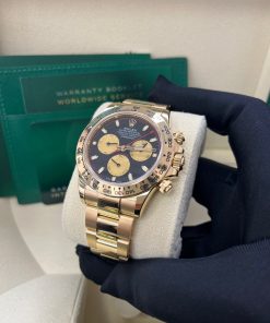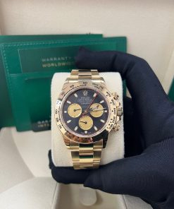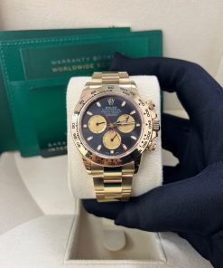 Crafted from 18K yellow gold, this iconic chronograph features a striking black dial with champagne subdials, embodying timeless elegance. The 40mm case is paired with a robust Oyster bracelet.