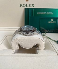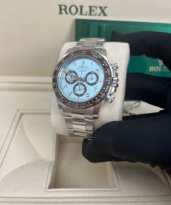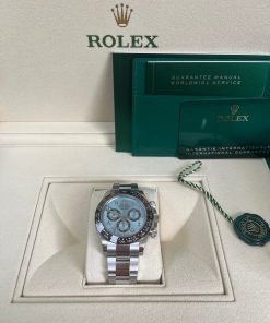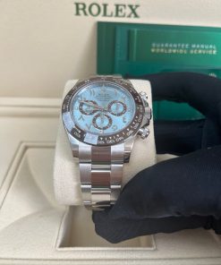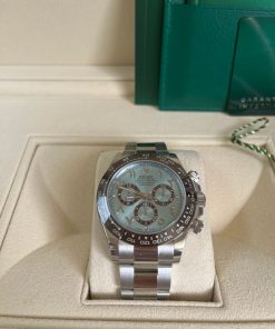 The Rolex Daytona 116506 is a rare and luxurious timepiece crafted from solid platinum. This piece features an ice blue sunray dial with ultra-rare Eastern Arabic numerals. Eastern Arabic numeral dials are exclusively found on watches sold to VIP clients in the Middle East.