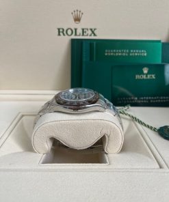 This rare dial is paired with a chestnut-brown Cerachrom ceramic bezel, enhancing its striking contrast. The 40mm case and Oyster bracelet are made of Rolex’s premium .950 platinum, which offers durability and signifies prestige. Platinum also makes the watch weigh more than steel or gold.