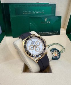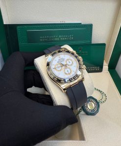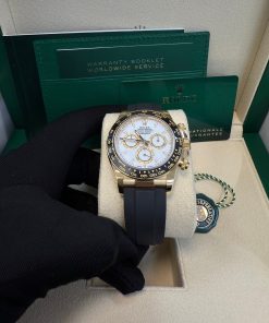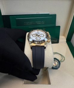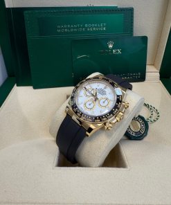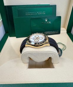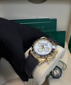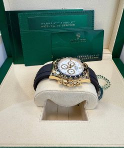 40mm 18K yellow gold case, screw-down back, screw-down crown with triplock triple waterproofness system, black monobloc cerachrom bezel in ceramic with moulded tachymetric scale, scratch-resistant sapphire crystal scratch-resistant sapphire, white dial, index hour markers, 4131, manufacture Rolex perpetual, mechanical chronograph, self-winding movement with centre hour and minute hands, small seconds hand at 6 o’clock, chronograph via centre seconds hand, 30-minute counter at 3 o’clock and 12-hour counter at 9 o’clock, stop seconds for exact time setting, approximately 72 hours of power reserve, Oysterflex strap made from flexible metal blades overmoulded with high-performance elastomer, folding Oysterlock safety buckle with rolex glidelock extension system. Waterproof to 100 metres / 330 feet.