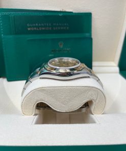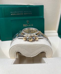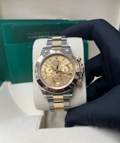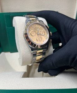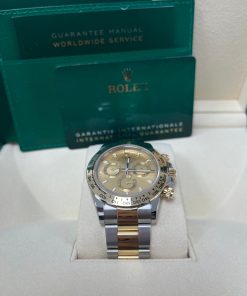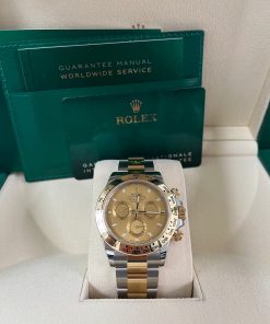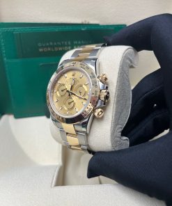 40mm Yellow Rolesor case with 904L steel monobloc middle case, screw-down steel back, screw-down crown and push buttons with Triplock triple waterproofness, fixed 18K yellow gold bezel with engraved tachymetric scale, scratch-resistant sapphire crystal, champagne dial, index hour markers, Rolex calibre 4130 self-winding movement with chronograph central second hand, 30-minute counter at 3 o’clock, and 12-hour counter at 9 o’clock, approximately 72 hours of power reserve, 18K yellow gold Oyster bracelet with flat three-piece links made from a combination of 904L steel and 18K yellow gold, folding Oysterlock buckle with Easylink 5mm comfort extension link. Waterproof to 100 meters.